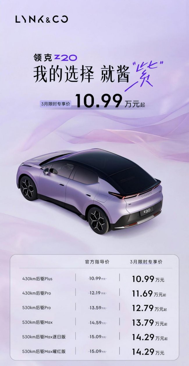 伴随马德拉紫的上新,领克Z20同步推出3月限时购车政策,全系车型10.99万元起,以诚意让利回应用户期待。除入门版外,其余配置均有0.5万至0.8万元不等的限时优惠,其中530km长续航版本优惠力度最大,让追求品质与个性的用户能以更轻松的方式拥有这份“紫色力量”。
