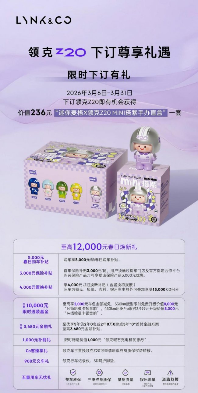 从马德拉紫的色彩哲思,到限时专享价的真诚让利,再到联名盲盒的惊喜加码,领克Z20正在用独特的方式与年轻人对话。选择Z20,不只是选择一辆车,更是选择一种态度:不迎合外界纷扰,只忠于内心秩序。在这个春天,用一抹紫,开启属于自己的“就酱紫”人生。
